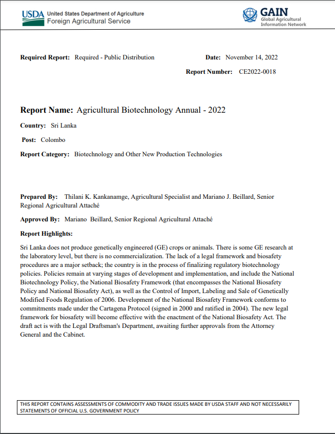 (2023) यूएस अहवाल श्रीलंकेत जीएमओ अन्न उत्पादनाची पुष्टी करतो स्रोत: AgricultureInformation.lk | युनायटेड स्टेट्स डिपार्टमेंट ऑफ अॅग्रिकल्चरचा दस्तऐवज